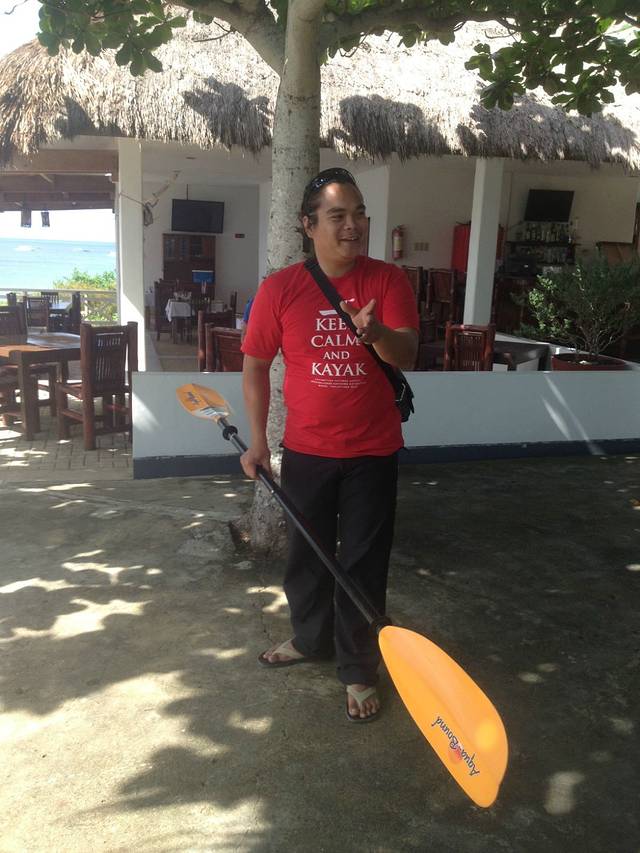出发前,教练还专门培训了一番,全英语教学,七七八八的听了个大概就动身了。其实不用听,看看教练的动作跟着学就好啦。心都飞到还上去了,哪里还有心思听这个……不过教练反复强调:不要离海岸太远,不要丢了桨,这两个我记住了。