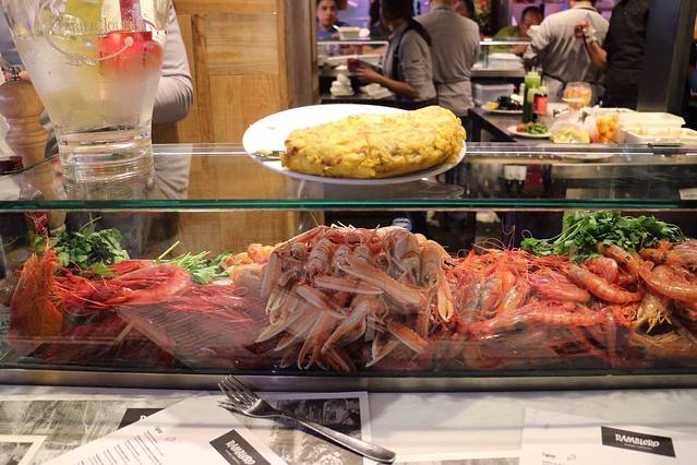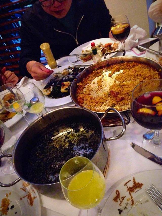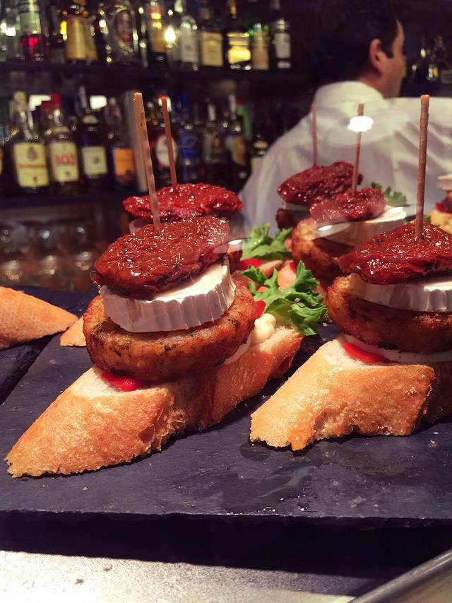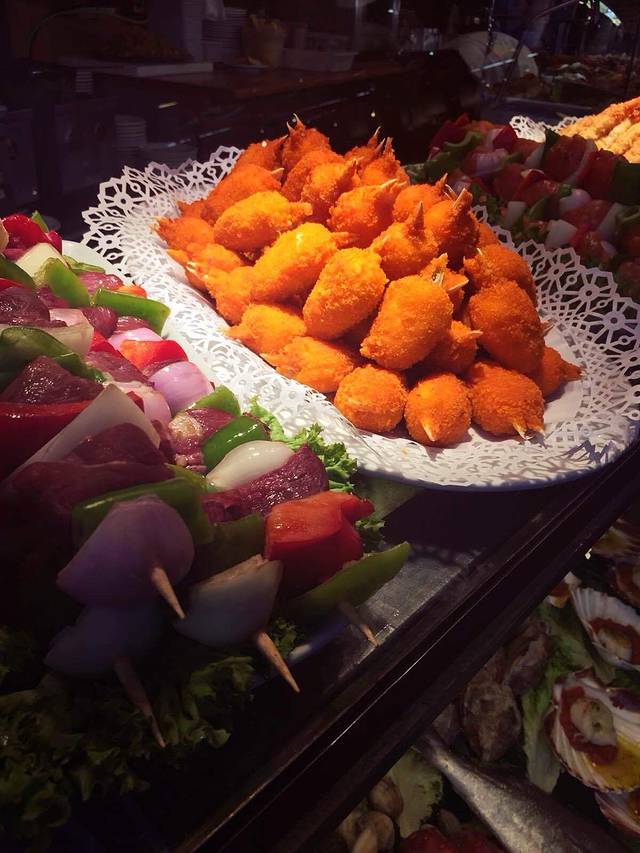 混着喝了一堆酒以后略有点晕乎,直接到不远处吃个晚餐。食物全都摆在柜子里的tapas完美的解决了我们各种看不懂西语点餐困难的尴尬。