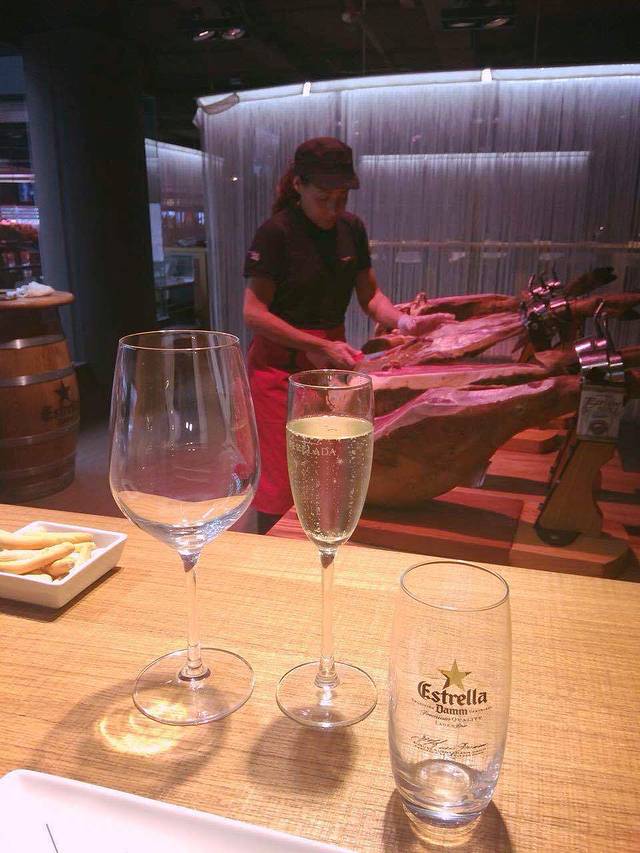 超亲切的店员给我们切火腿,并一一介绍每一种细微的口感差别和产区产地。旁边还有图示,完全不会听不懂。可以选择红酒,起泡酒CAVA,啤酒或者白水来清口,桌上的橄榄油小饼干也是火腿的配餐。按姑娘的说法,一整只7kg的火腿在他们店里只需要一两天就会被吃光