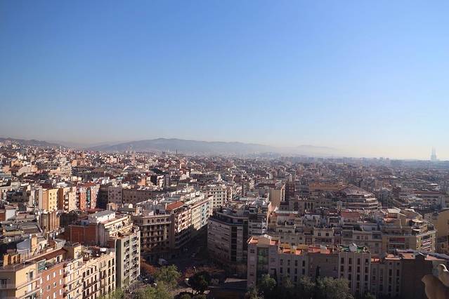 从诞生立面50m高的地方俯瞰巴塞罗那。这个城市真是最不容易迷路的城市,每个block的大小形状都极其一致,从飞机上看更为明显,简直可以拿这里的路口们来下一盘棋了。