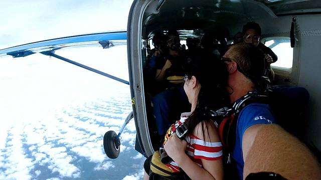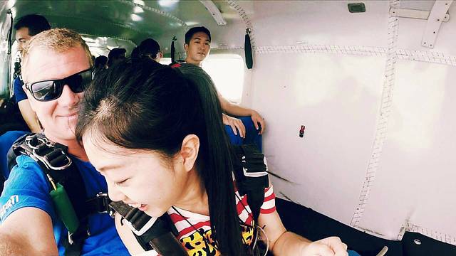 因为第一个跳所以全程坐在落地窗旁边,滑行的时候教练都没有关飞机门,我都以为就要这么一直开着门飞上去了呢还兴奋了一阵子,后来离地高了之后还是关上了。大概飞到10000feet快要跳了,教练才会把你彻底固定在他身前,固定的很结实会有很强的安全感。