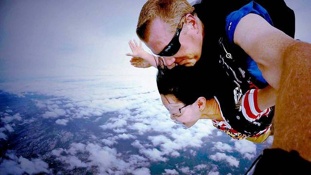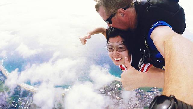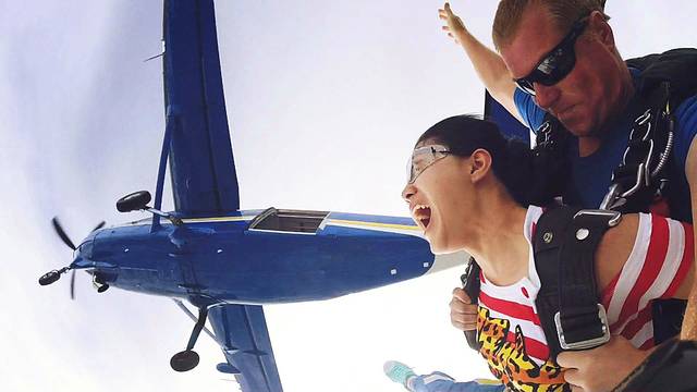 之前说过我的教练很活泼我也很活泼,大概就是太活泼了教练就玩了起来=先把我头和上半身放出飞机吹了好一阵子风,Ok I’m ready!然后拉了回来……又转过来把我下半身扔了出去,再把头放出去,恩好的我又准备好了!拉了回来……后来已经把我人整个扔在飞机外面了,教练自己靠着飞机,不知道跟后面歇了多大一阵子,才终于跳出去。==后来跟后面跳的加拿大小哥还有哥伦比亚小哥聊天,他们说看的都惊呆了——看到我在飞机边,这么大个人突然就没了的时候心咯噔了一下。哈哈要是这么说,感觉第一个跳还是挺好的,我要是先看到一活人这么掉下去=指不定吓成什么样=