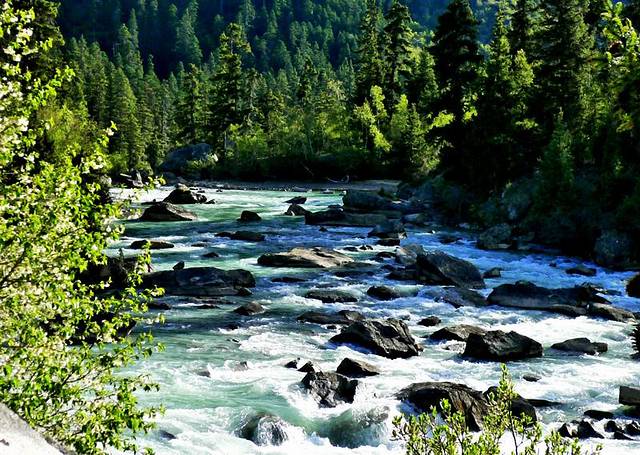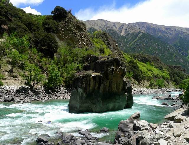 尼洋河是位于雅鲁藏布江北侧的最大支流,它发源于米拉雪山,由西向东流,在林芝县汇入雅鲁藏布江。尼洋河中游有一处景观叫“中流砥柱”。在山高沟深,河流湍急的河中,一块巨石傲然屹立,河水冲击到这块巨石上,溅起一片浪花,翻滚激荡,夺路而去。相传这块巨石是工布地区的守护神工尊德姆修炼时的座椅。