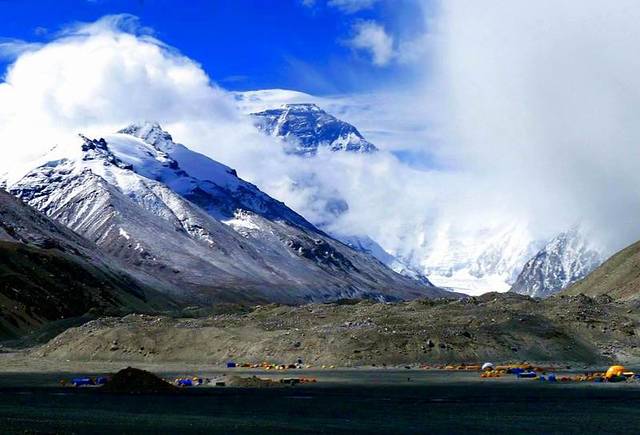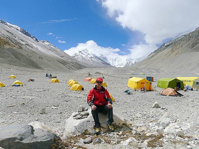 摄于珠峰大本营。珠峰大本营海拔5200米,位于绒布寺南方,由一群帐篷旅馆围成,中间树立一面国旗和一面珠峰保护区旗帜。珠峰大本营主要是提供游客住宿,有卫生间和帐篷邮局,是我国海拔最高的邮局。