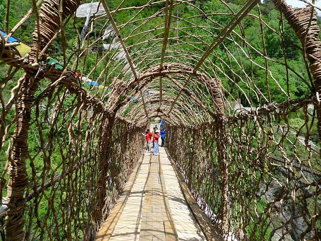 摄于鲁朗镇附近的拉月藤网吊桥。拉月藤网吊桥横跨东久河,跨度112米,距河面27米,采用6000公斤当地树藤编制而成。该桥模仿墨脱县的跨江藤网吊桥而建。藤网桥是珞巴和门巴族独有的桥。