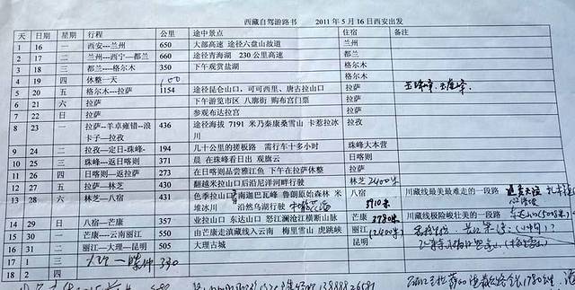 这项任务主要由我来完成。虽然自驾车走青藏公路和滇藏公路是第一次,但青海、西藏、云南我过去都去过,有的还不止一次。根据过去的经验,再参考网上的一些攻略和路书,我们制定了一个20天的西安至昆明路书。一路走下来,除了个别地方因为修路,临时改变住宿地外,基本上是天衣无缝地完成了既定目标和行程(原计划中的“车辆维修保养机动日”,没有用)。有些朋友对路书不太重视,习惯随遇而安。个人觉得这个习惯不好。对自驾游和自助游者来说,一个好的路书,应该是成功旅游的前提和保证。希望我们的“天路19日”,会对喜欢这条路的朋友有所帮助。