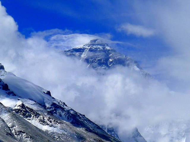 偶尔露峥嵘的珠穆朗玛峰。 珠穆朗玛峰,简称珠峰位于中国和尼泊尔交界的喜马拉雅山脉之上,终年积雪。2005年10月中国测绘局所测得的精确高度为8844.43米,为世界第一高峰,中国最美的、令人震撼的十大名山之一。