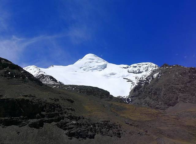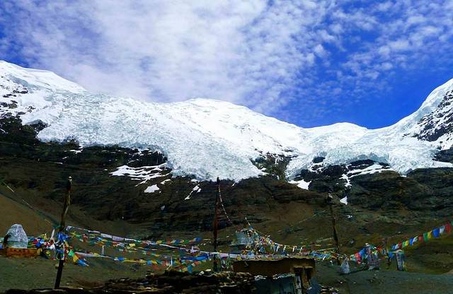 乃钦康桑雪山是西藏四大神山之一,位于西藏浪卡子县和江孜县交界处317省道旁,海拨7191米,由于高寒,山体顶部尖锥突兀,常年终日白云缭绕,飘撒粒雪,终年累积、压实,形成了厚达20—100米的冰层,冰层受本身重力影响,缓慢移动发育成了多条冰川.