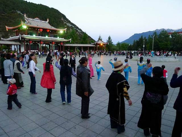 八一镇是林芝地区首府,镇上商店林立,市集热闹,食宿方便。图为八一镇居民傍晚在跳锅庄。