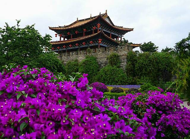摄于大理古城。大理古城位居风光亮丽的苍山脚下,距大理市下关13公里。大理古城始建于明洪武十五年(1382年),是全国首批历史文化名城之一。大理古城的城区道路仍保持着明、清以来的棋盘式方格网结构,素有九街十八巷之称。南北对峙的两座城楼被修复一新。城内由南到北,一条大街横贯其中,深街幽巷,由西到东纵横交错,全城清一色的清瓦屋面,鹅卵石堆砌的墙壁,显示着大理的古朴、别致、优雅。