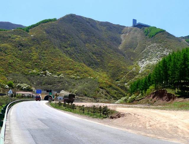 摄于西安至兰州途径的六盘山隧道前。山上是著名的红军翻越六盘山纪念碑。