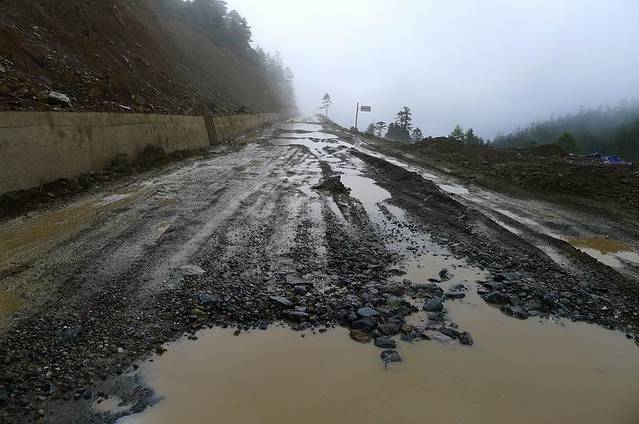 通麦天险沿线的山体土质较为蔬松,且附近遍布雪山河流,一遇风雨或冰雪融化,极易发生泥石流。图为通麦天险的木桥,仅能容一辆车通过。
