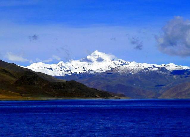 然乌湖畔西南有岗日嘎布雪山,南有阿扎贡拉冰川,东北方向有伯舒拉岭。四周雪山的冰雪融水构成了然乌湖主要的补给水源,并使湖水向西倾泻形成西藏著名河流雅鲁藏布江重要支流帕隆藏布江的源头之一。照片摄于岗日嘎布雪山。