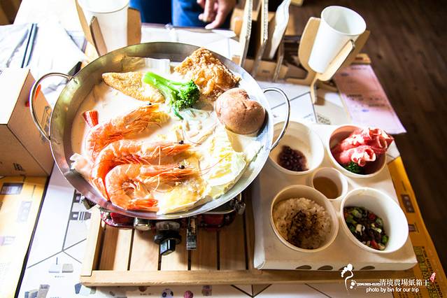 边坐在纸壳拼成的椅子上品尝着用纸皮餐具装的美食(当然火锅没有)