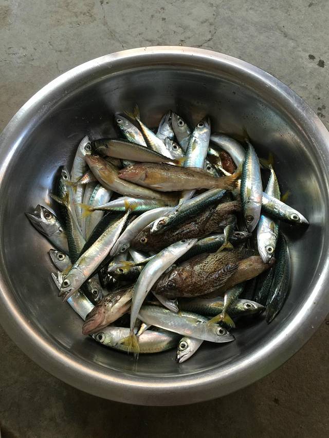 我也不知道这是什么鱼,用串钩钓上来的,一下子能上来4,5条,非常有成就感。他们非要自己钓,结果一下午没上来几只,哈哈