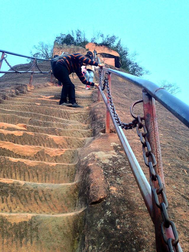 丹梯铁索大概70度陡左右吧, 要攀两次要扶着梯级上的.