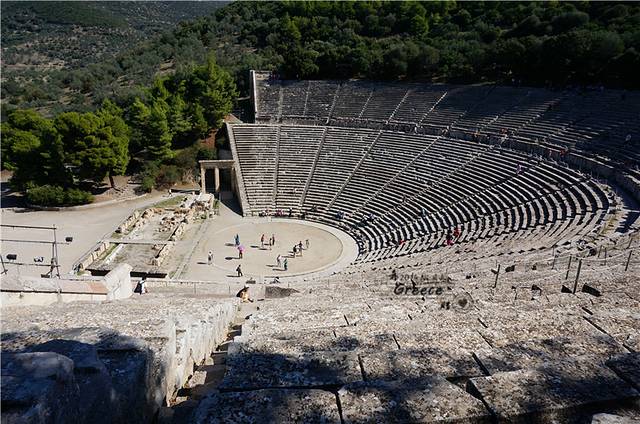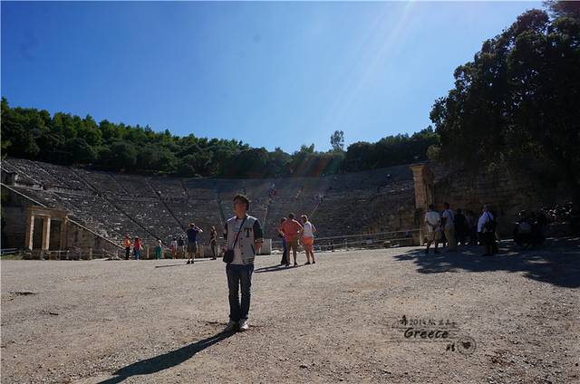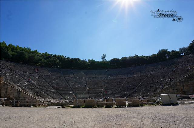 埃匹达鲁斯古剧场。这里是祭祀医神阿斯克列皮亚斯的圣地。建于公元前45年,距今已有2500年,每年的埃匹达鲁斯庆典就在这里举行。圆形的大剧场从底层向上扩展,可以容纳18000余名观众,站在剧场中心的圆圈中,即便是撕一张纸的声音,在剧场的任何一个角落都能听得清清楚楚,在没有音响设备的古代,将声学原理在建筑中加以利用,达到了令人难以想象的演出效果。