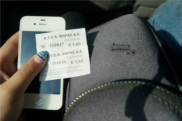 2、公交-车票是直接上车买,会有人来收钱。有的在快要下车了才来收钱,在圣岛上公交车通往的地方很多,例如:Fira,Oia,Kamari,汽车总站贴有时刻表,大家可以先拍照下来。希腊人特别不准时,一辆车坐满没了位子,问BUS站工作人员多久来一辆,他告诉我等5分钟,可我整整等了50分钟车子才来。