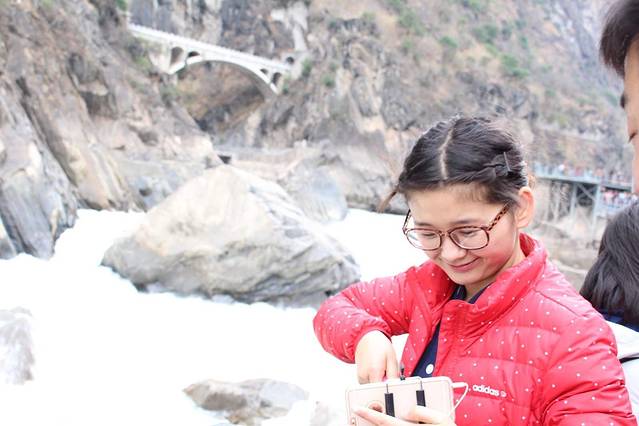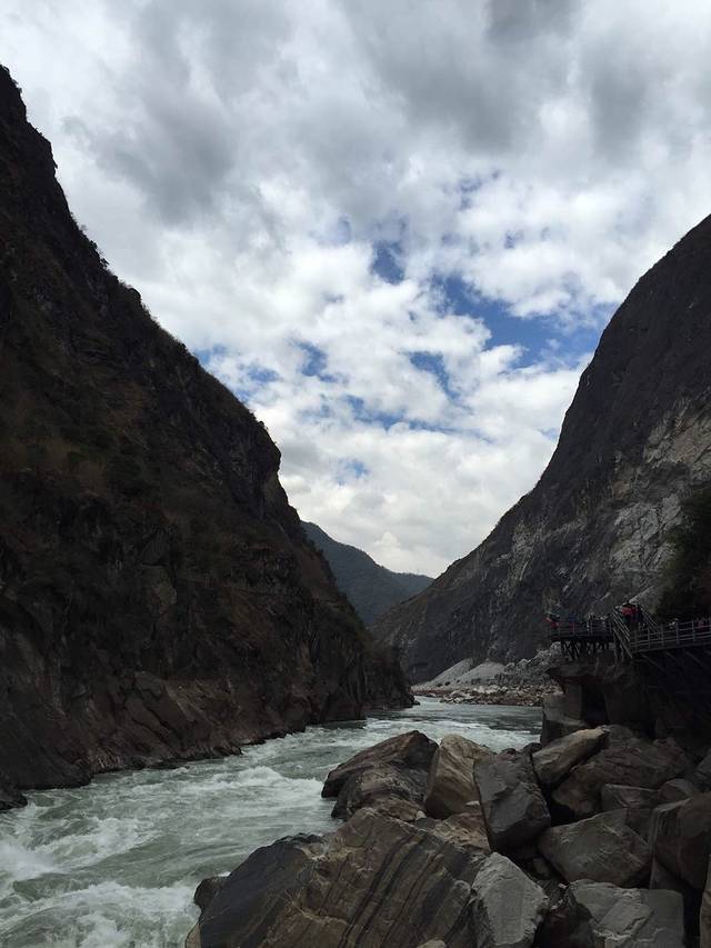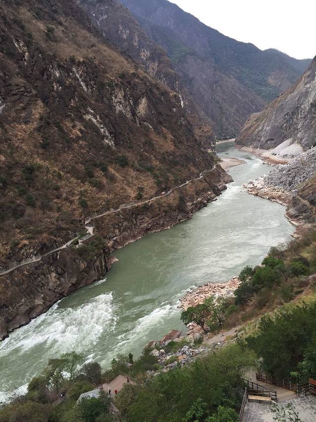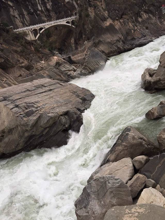 喘急的河水,从中间一个大石头分流而过。因曾有猛虎跃江心石而过,因此得名。下去很快,上来差点没累死在木栈上。虎跳峡门票拿学生证可以半价。