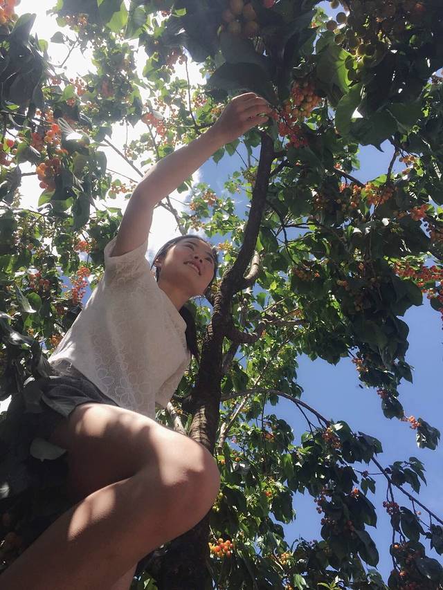 来到丽江古城的客栈,院子里的樱桃熟了,美丽的老板娘让随便摘。你看着妹子分分钟爬到树上。