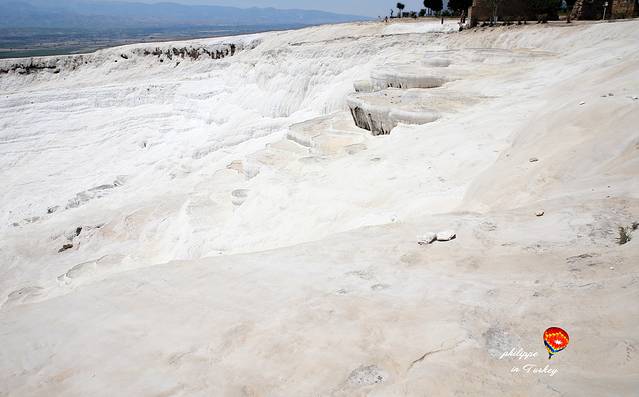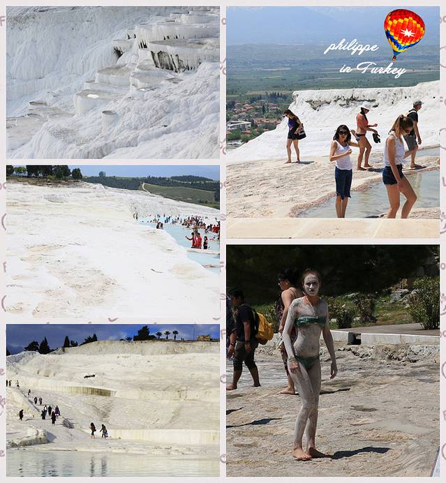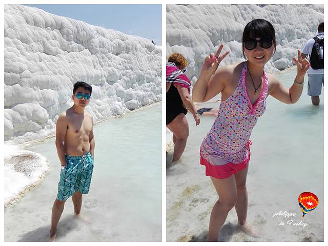 进入棉花堡山坡的入口,就必须要赤脚了,可以穿厚袜子,以防鞋底磨损棉花堡的石灰岩。沿山坡而上,白白的“棉花”踩上去并不光滑,走上去甚至有点举步为艰,但是保护环境人人有责,就当是全套的足底按摩吧。在棉花堡上的温泉是不收费的,所以来此泡温泉的游人络绎不绝,我们看到很多西方游客干脆宽衣下水,亚洲面孔的都很羞涩,顶多就泡泡脚。