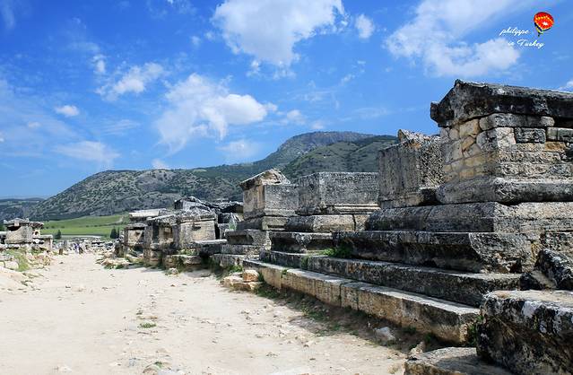 赫拉波利斯古城的主街道有1公里长,主要的建筑物都排列在街道的旁边,街道两侧的小巷都与街道成直角形。在遗址上可以看到较为重要的一些建筑物包括剧院、八角形建筑、纪念门、罗马式建筑房间和大墓地。我们根据导游图上的图标和序号一边走一边对照着,基本上都是残垣断壁,看不出昔日的辉煌了,只能凭借自己的想象了。