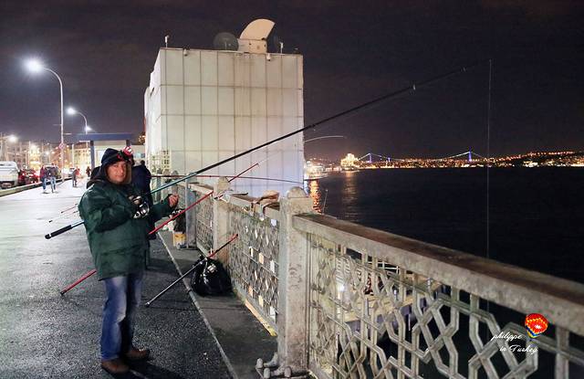 夜晚在加拉太大桥上的垂钓者