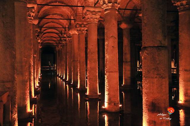 地下水宫的入口与圣索菲亚大教堂一条马路之隔,在街心花园的一角。它的历史要追溯到公元六世纪,据史料记载,地下水宫是公元542年朱斯提尼安大帝动用七千名奴隶在教堂废墟上建成的,一方面为的是保证宫廷用水供给,另一方面是防止敌人围困,有备无患。这座地下水池可储十万吨水,如果蓄满了水,据说可供当时全城人喝一个月。到了奥斯曼帝国时期,水宫被废置,直至十六世纪中期,荷兰人无意发现了它,才使其重见天日。336根巨大石柱构建的巨大宫殿里,那悠长旷远的音乐配合着滴水潺潺,仿佛步入了另一个神秘莫测的世界。