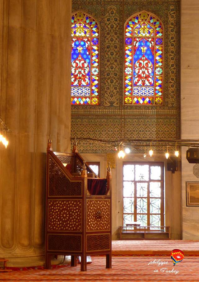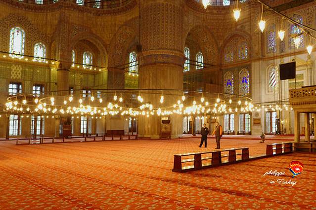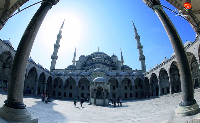 世界闻名的蓝色清真寺是伊斯兰教最优秀的建筑师锡南 ( Sinan ) 的得意弟子Mehmet Aga的作品,是伊斯坦布尔最重要的建筑之一, 建于苏丹艾哈迈德一世统治时的1609年至1616年。清真寺内部墙壁全部用蓝、白两色的依兹尼克瓷砖装饰,外部周围矗立着六根尖塔 。建造蓝色清真寺的过程中没有使用一根钉子,历经数次地震却从未未坍塌。蓝色清真寺( Blue Mosque )其实得名于伊兹尼蓝磁砖的光彩,它真正的名称是素檀何密特清真寺( Sultanahmet Camii ),曾经是伊斯坦布尔旧市街的中心。走过门框均由大理石铺成的三道门,便进到内庭,里面粉红砾石、大理石或斑岩的大石柱之间以拱门相连接,拱顶着30个圆顶。用于洗礼的喷水池占据了内庭的中心,四周是6根大理石石柱。中央圆顶通过角穹靠在4个突出的拱上,角穹则依次倚托在4个直径1.6米的、巨大的、圆型的、有凹槽的角柱上,4个半圆顶各占中央圆顶的一方,各个角边的小圆顶则构成了清真寺的底座。苏丹的画廊在左边角处,旁有阿赫迈特一世的忏悔室。