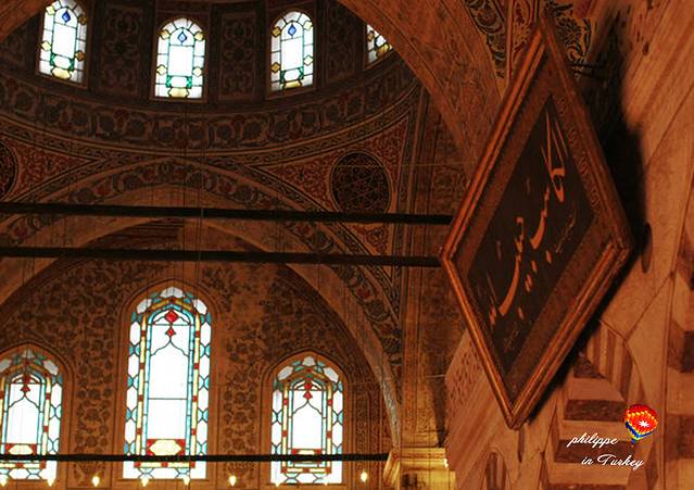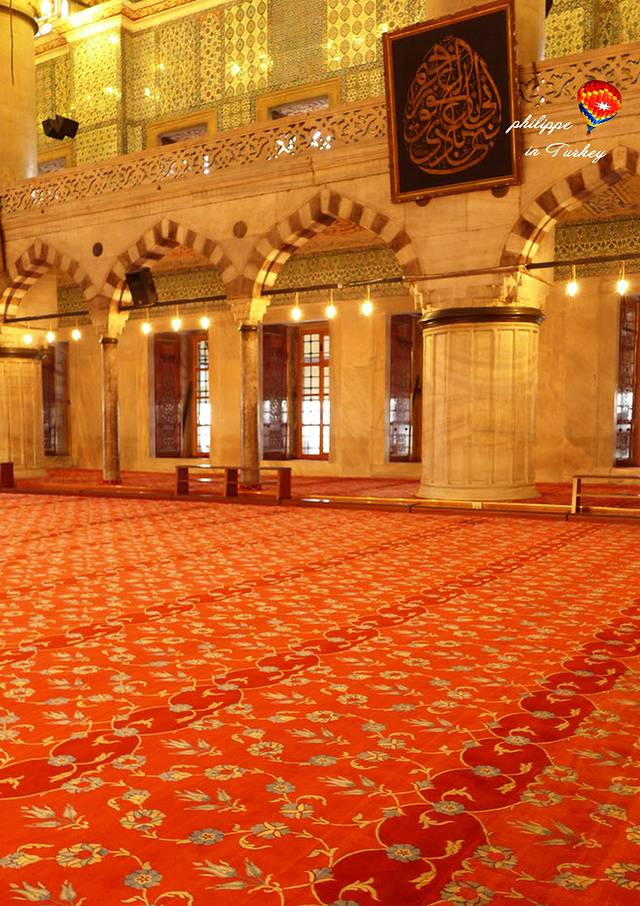 第三是地毯。寺内铺满了的伊索匹亚的朝贡的地毯。 在奥斯曼时期, 能表示一个人或者一个家庭身份的,不是什么金光耀眼的黄金首饰,也不是什么金丝玉帛,而是精美却不乏朴实的手工地毯。这看似不起眼的地毯却凝聚了土耳其艺术文化的精髓。它既继承了土耳其的古老传统,又吸收了民间艺术的精华,是土耳其民间艺术最值得骄傲的地方。