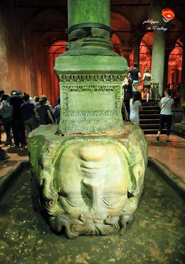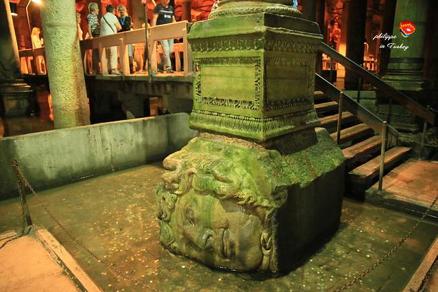 水宫之所以充满神秘色彩,还因为这里囚禁着邪恶的神灵—蛇发女妖美杜莎,在希腊神话中,凡人只要与她对视,便会化作石像。在水宫的尽头,两个巨大的石柱下面压着女妖的头像。一个正脸朝下,另一个则侧脸向下。头像为何如此放置?至今仍无人知晓正确答案。有些人说这是为了镇池,以防止有不好的生灵侵犯这里的环境;但也有人认为这不过是因为有两根石柱短了一截,用雕刻了美杜莎头像的石块垫上而已。这样简单而随意的举动却又不太符合这一庞大宫殿的设计,不过正因这个千年未解之谜,才让此处声名在外,更加耐人寻味。