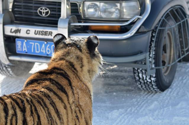 老虎们似乎都知道那部车有吃的,纷纷围聚了过来