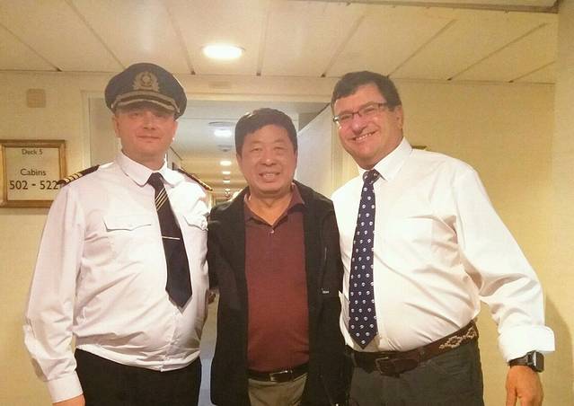 跟船长和探险队长合影。我平时觉得自己挺壮,可跟这两老外一比,差远了!