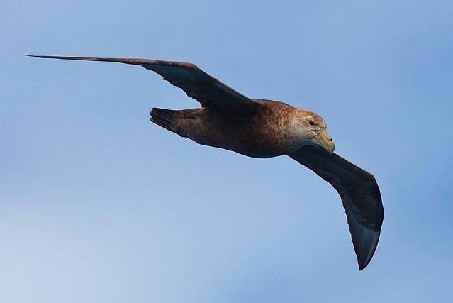 南方巨海燕是南极代表性鸟类之一。体重达4-5公斤,飞行时,两翼端间的距离可达2。2米,起飞时,必须在地上或水面上助跑10多米远的距离才能起飞,就像飞机在跑道上起飞一样。