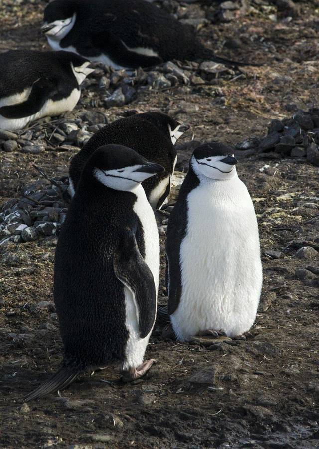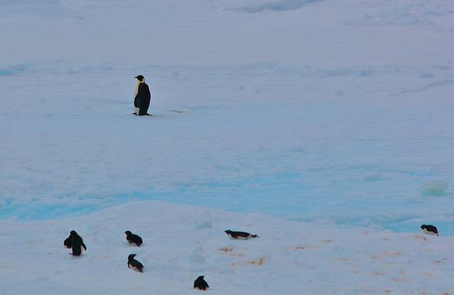 远远的几只阿德利企鹅看着帝企鹅: 这大家伙怎么这么大?它跑这来干什么?
