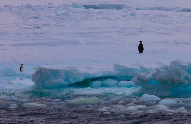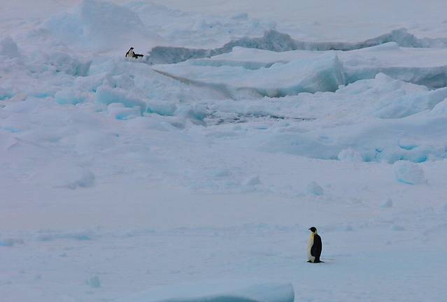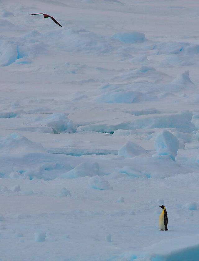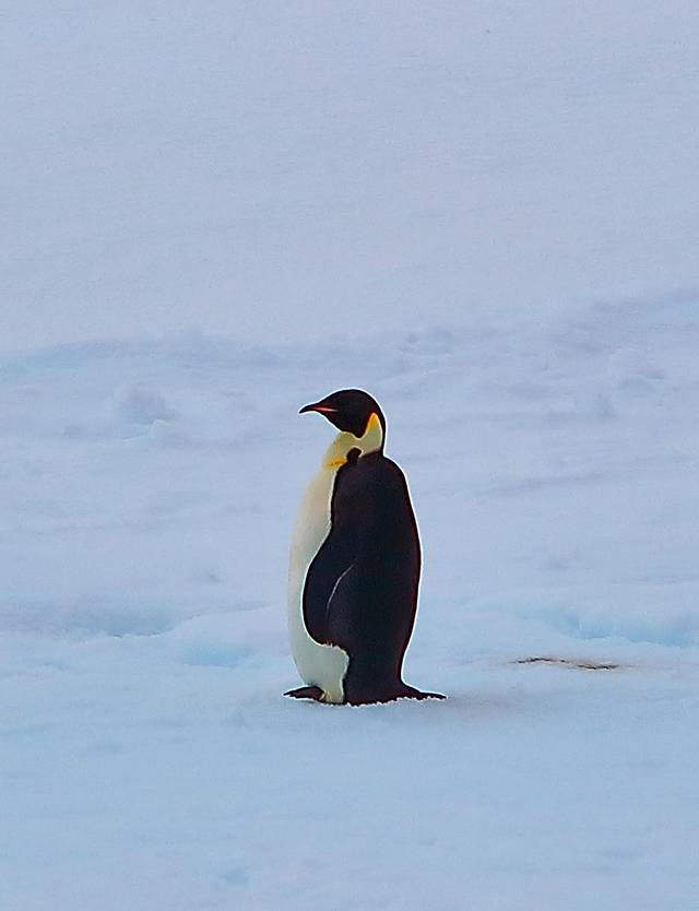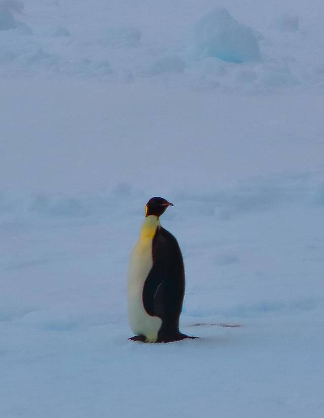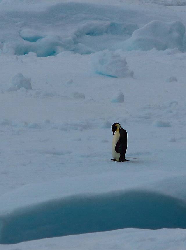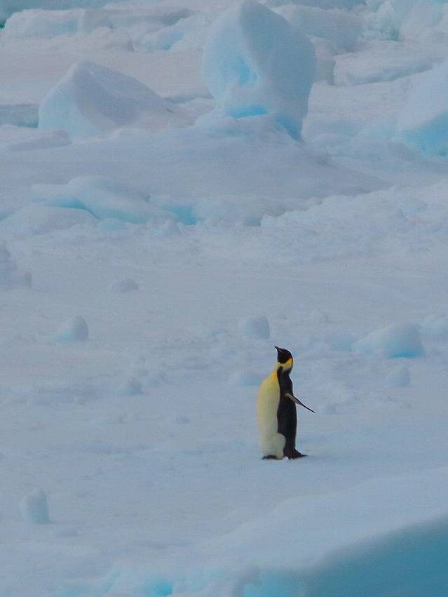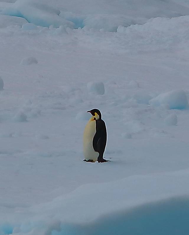 帝企鹅主要分布在南极大陆位于南纬66-77度之间的许多地方,例如靠近威德尔海的科茨地和靠近罗斯湾的维多利亚地,都有相当数量。但是我们竟然在去布朗断崖(brown bluff)南纬63.5度地方的冰架上看到它。还是孤独一只!