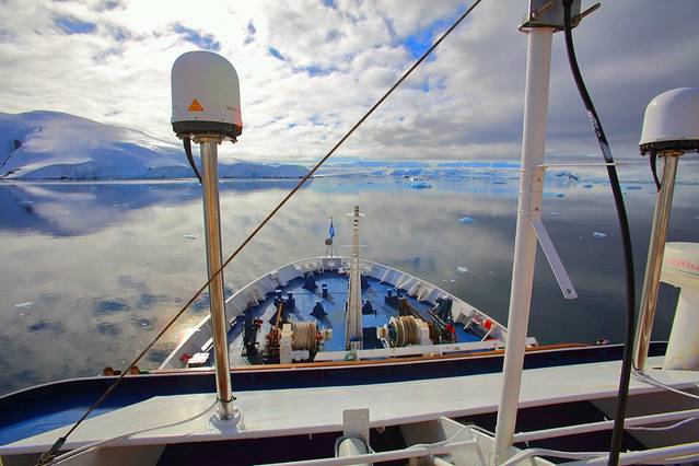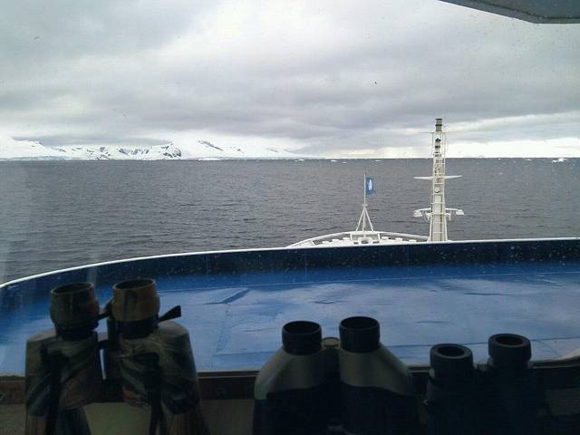 起早了!又到驾驶舱观摩。拿高倍望远镜瞭望一番,看到前边准备登陆的Orne Harbor 64º 38.1’ S / 062º 32.2’ W 。
