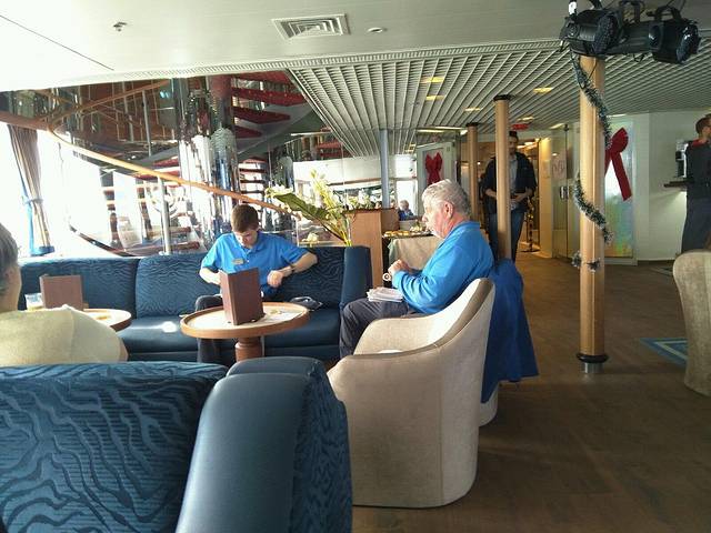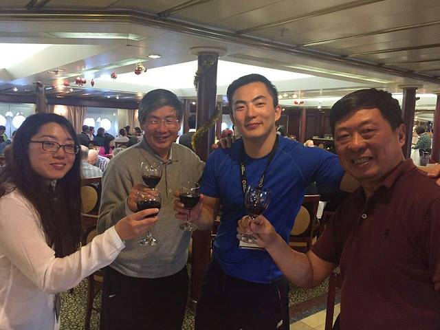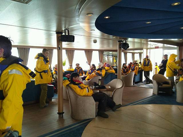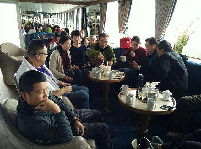 睡觉前先吃一片船上发的晕船药,一定要嚼碎了吃!睡得正香船晃得把桌上的遥控器掉到地方,两人同时爬起来把桌上带的酒收好,哈哈大笑接着睡。不到7点,被电话叫醒,先到四楼喝点咖啡。看来兴奋可以抵御晕船症!早餐后,没晕船的到多功能厅参加南极登陆、生物安全、冲锋舟乘坐须知的会议。接着吃饭-睡觉-吃饭-睡觉