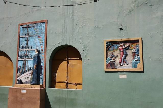 走进彩色的博卡老街,就能感受到浓郁的异国情调。这里,曾经是布宜诺斯艾利斯最贫穷的河口区。墙上的港口/水手/探戈舞浮雕。