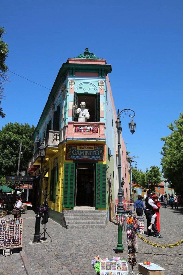 作为一个历史上的老港口,博卡一直是码头工人、水手聚集居住的地方。工人又大都来自欧洲的西班牙、意大利等国家,他们手里搭盖的房屋就带有欧洲建筑的风格,他们把涂刷船只剩下的各种油漆带回家,涂在自家的房屋、街道上,渐渐的,就形成了现在我们所看到的七彩街。而工人、水手们一天劳碌下来,晚上三五成群在酒吧喝酒,跳舞,因为有色情舞女的加入,又慢慢形成了现在奔放、疯狂的激情探戈舞。