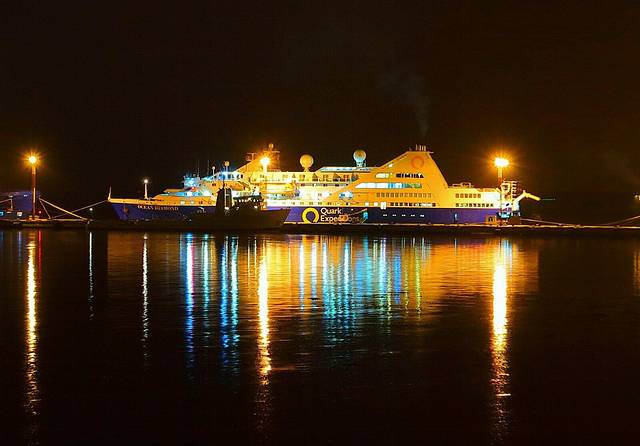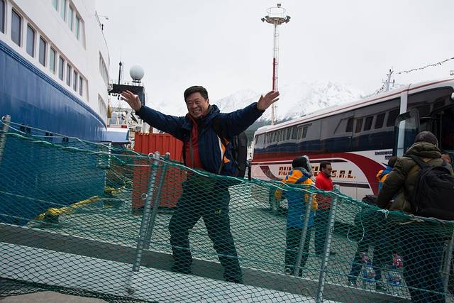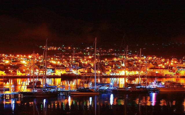 晚饭后,冒着雨加雪的天气到码头,对面停泊的QUARK EXPEDITIONS就是我们明天将要乘坐的船。不到万吨。出发时,考虑在船上晃得厉害没有稳定的时间,而登岛时间都比较紧,所有就没带三脚架。出来拍夜景就不方便了,放到四秒的曝光怎么都稳不住。谢谢同行李勇的三脚架让我拍下这美景。
