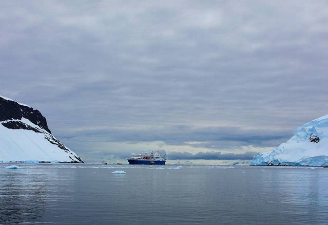 今天应该是我们南极半岛游的最后一天。到达天堂港Paradise Harbour 64º 49.3’ S / 062º 52.5’ W 。天堂湾地理位置特殊,与外界的联系完全被两座岛屿所阻挡。外面狂风恶浪里面风平浪静。