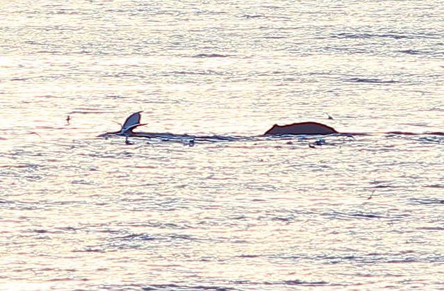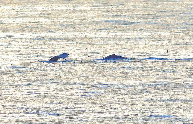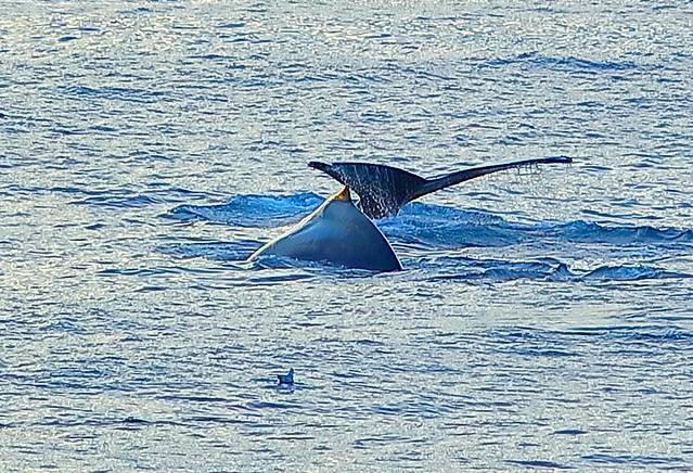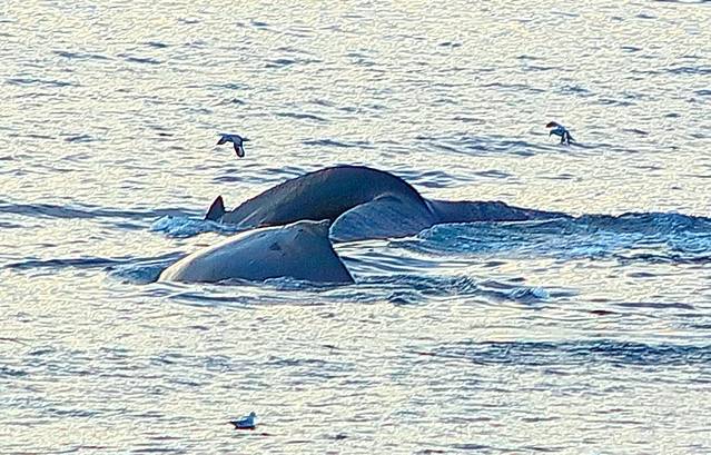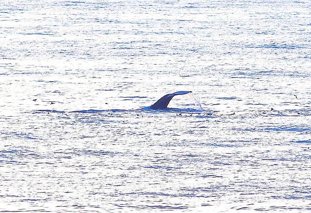 喷出的水柱细而直的是须鲸。我们的船也追着鲸鱼跑了一会儿,可没它快啊!
