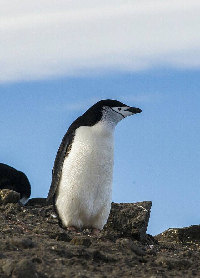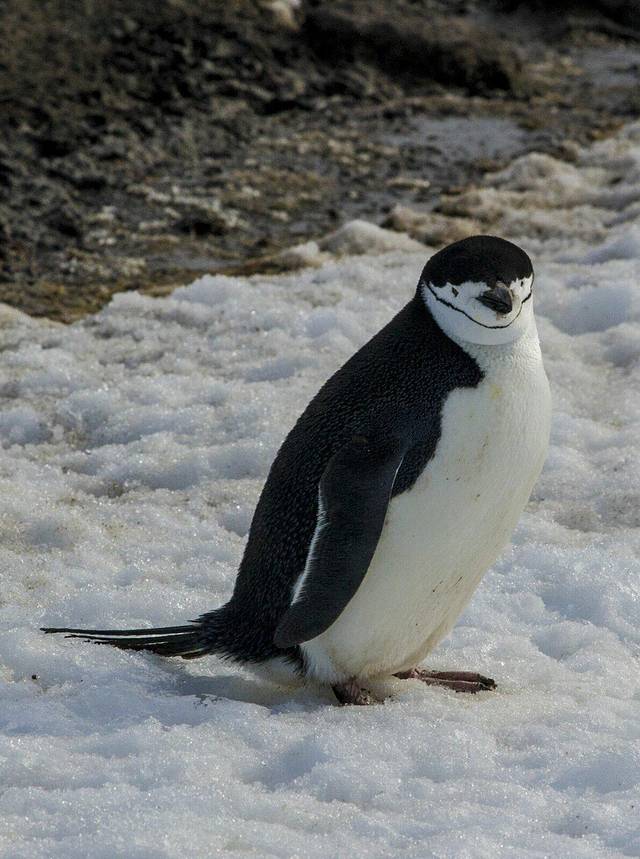 帽带企鹅(学名:Pygoscelis antarctica):最明显的特征是脖子底下有一道黑色条纹,像海军军官的帽带,显得威武、刚毅。苏联人称之为“警官企鹅”。其头部下面有一条黑色的纹带,使它们看上去好像在戴着盔帽一般,故又称颊带企鹅,亦因为它们有这些特征,它们成为了最容易被辨认的企鹅之一。它们体长72厘米。
