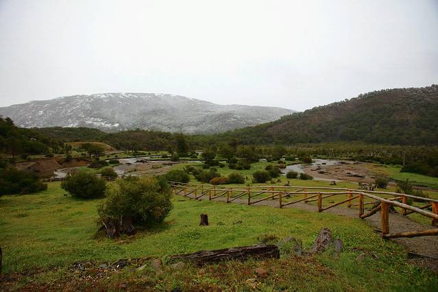 公园入口处有一座圆木搭起的牌楼,四周是莽莽苍苍的山林,正面是用西班牙文写着的“火地岛国家公园”的牌子,背后一行字“认识祖国是你的义务”。火地岛公园保持着原始风貌,沼泽、湖泊、草原、森林、雪峰、冰川组成了一幅幅美丽的画卷。雪线很低,也就500多米,年均温低于 10℃,极地景色迷人,到处充满着奇妙色彩。我们一到火车站,天空就飘起鹅毛大雪。