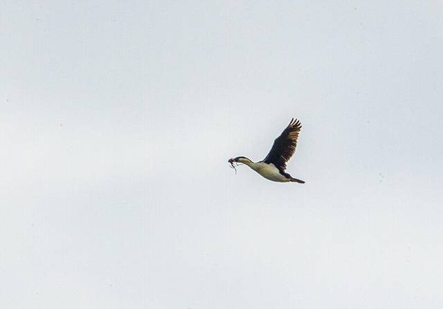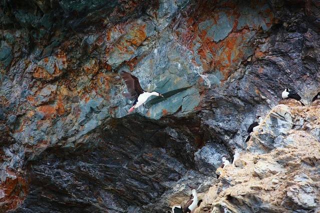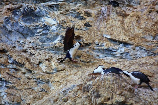 悬崖处栖息的南极鸬鹚。一只南极鸬鹚在给雏鸟喂食。喂雏的方法是把鱼贮藏于粗大的食管内,在喂食时,小鸟张开嘴,雏鸟伸嘴入小鸟的咽部,在小鸟的口腔内啄食半消化的鱼肉。