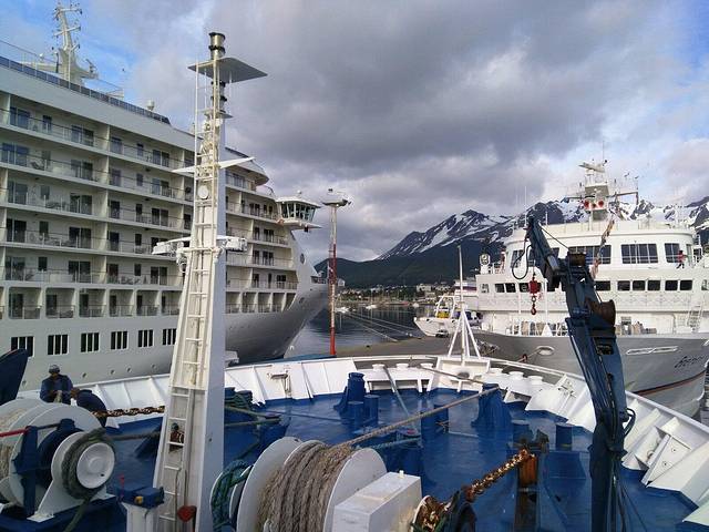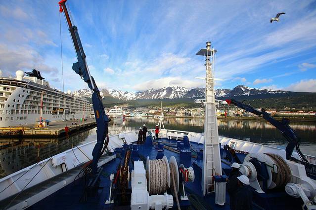 船上看傍晚的乌斯怀亚很有味道啊!若天黑前出港,可以观看毕哥水道Beagle Channel两边连绵不绝的雪山,非常漂亮!