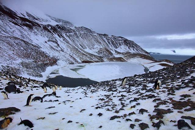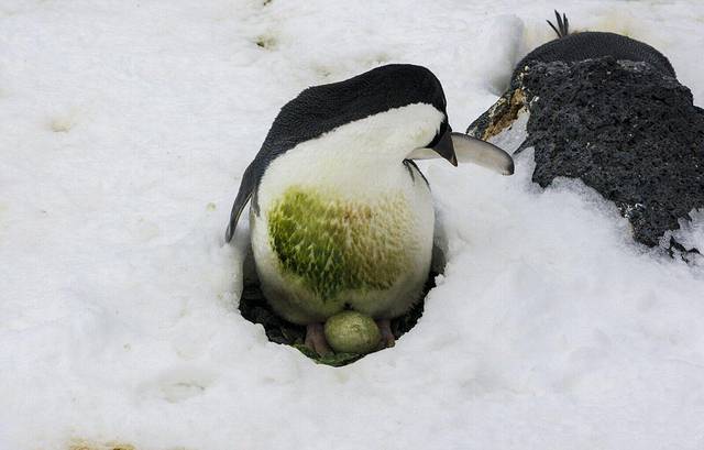 山顶遍地都是孵蛋的企鹅,趴着不动的跟那黑色的火山大石头没两样。探险队员一再叮嘱我们,看好脚下,别踩着企鹅。