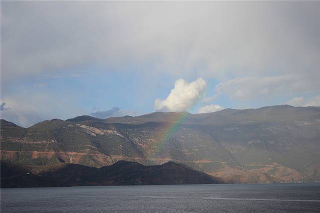 找客栈老板搞定了今天去泸沽湖的专线车,目前丽江去宁蒗的原路在修路,据司机师傅说,修完了从丽江到泸沽湖就只要3个小时了。现在去泸沽湖都要绕路,总共7个小时左右,大概下午3点不到就能到达泸沽湖,和司机约了一大早在市一中路口等车,不敢耽误,早早地起了床,收拾行李,蹑手蹑脚地打开客栈的门,正式向泸沽湖出发。上车便开始补觉,不过这车子行走在山路十八弯间,左晃右晃睡不踏实。慢慢太阳升起来了,可以看到窗外的片片农田,很漂亮。中间师傅会在某个厕所前停车休息一会儿,然后接着上路。(路途中的厕所是收费的,所以过来最好提前准备好零钱),路途一条绿绿的江水映入眼帘,原来就是金沙江!看似近在眼前,但是要翻好久的山路久才能越过这条江。过了金沙江上的大桥后到达中午吃饭的地方,下车看看这些菜就没什么胃口,路上吃了昨天买的面包和苹果,还不算饿,决定走路去近距离看金沙江。于是乎就趁着吃饭的这点时间,我们小跑来到金沙江边,绿幽幽的河水、平静的河面,与周围的群山融为一体,构成一幅大气回荡的画面。