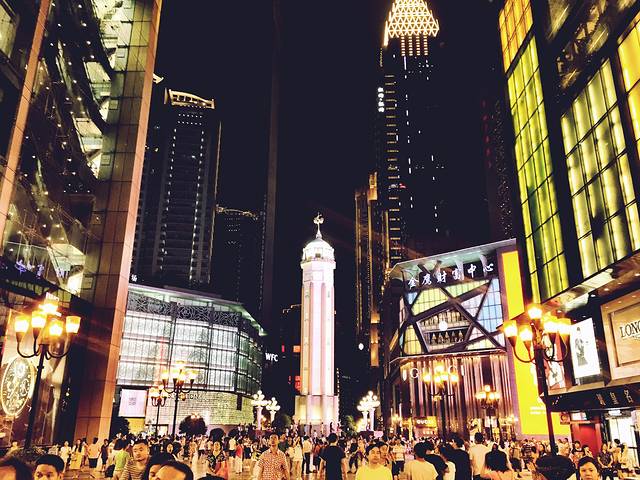 解放碑即是一个纪念碑的名字,也是重庆的一个商业圈,围绕解放碑附近有很多商城,是逛街的好地方,晚上人很多。